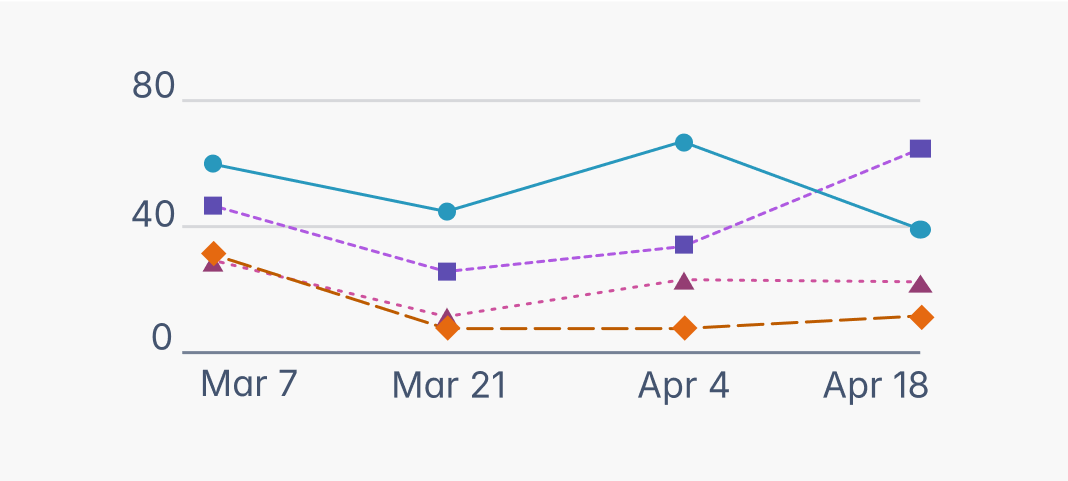 Avoid using just color to communicate meaning in your data visualization. Incorporate other visual indicators such as shapes, line texture, patterns, or direct labels to support users in making sense of the data. Highcharts provide some good examples of these accessible chart experiences.