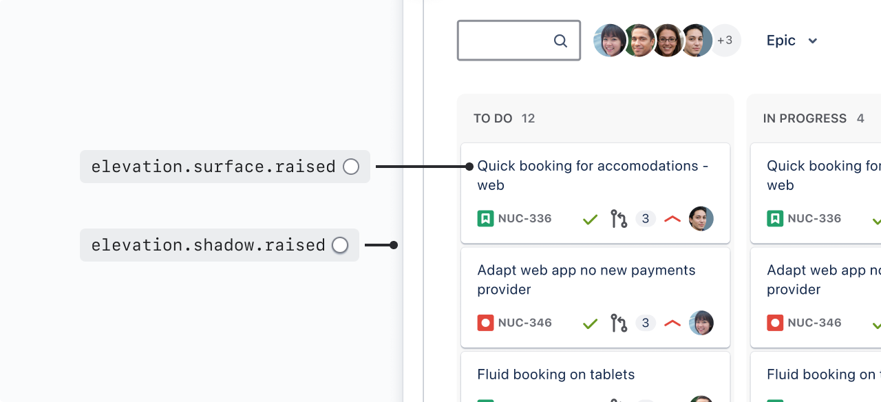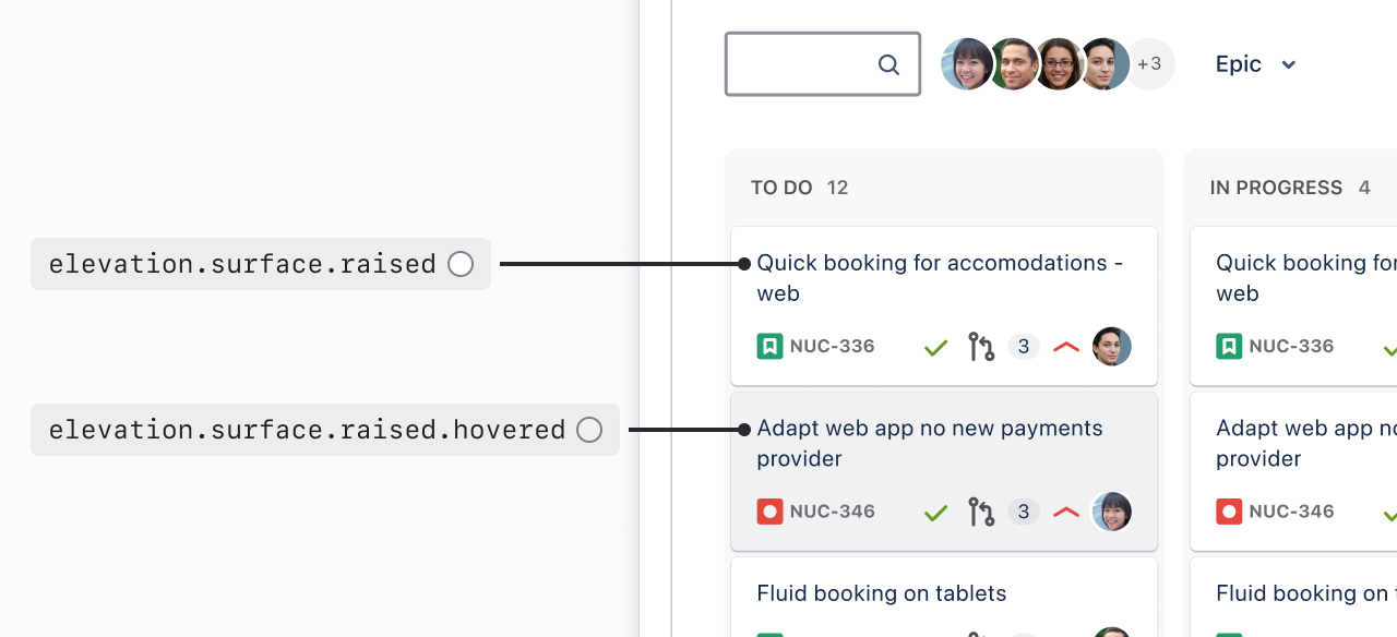 Raised elevations sit slightly higher than default elevations. They are reserved for cards that can be moved, such as Jira and Trello cards. In special circumstances, they can be used for cards as a way to provide additional heirarchy or emphasis.