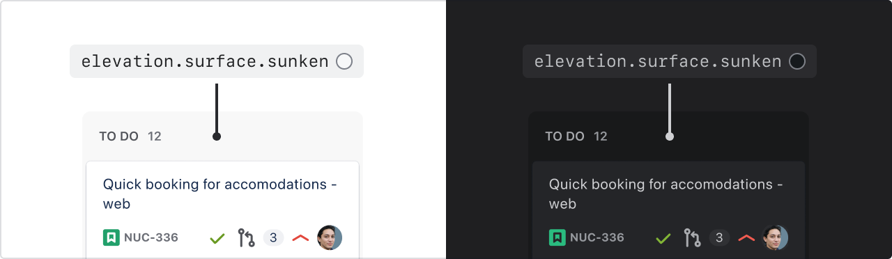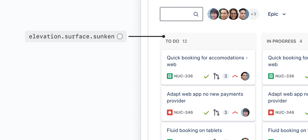 Sunken is the lowest elevation available. The sunken surface creates a backdrop (or well) where other content sits. Columns on a Kanban board are a good example of the sunken elevation.