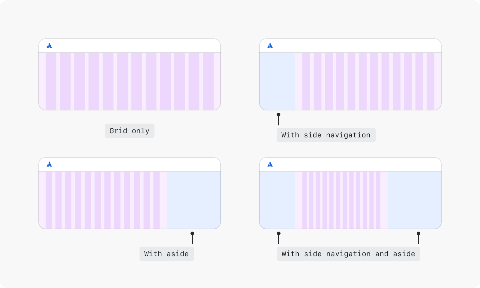Use an aside to display supporting content on a screen, such as help panels or secondary tasks. The layout grid typically fills the full width of the viewport, but when the side navigation or aside is present, the grid should resize to fit the remaining area of the page.