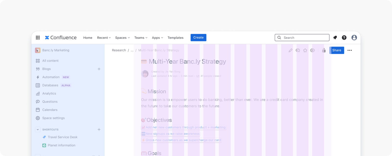 Fixed-narrow grids are best used for content-focused pages, such as blogs and articles, to limit line length and improve readability. Some internal elements, such as headers, may break out of the grid to span across the page. Here’s how a fixed-narrow grid is applied in Confluence: