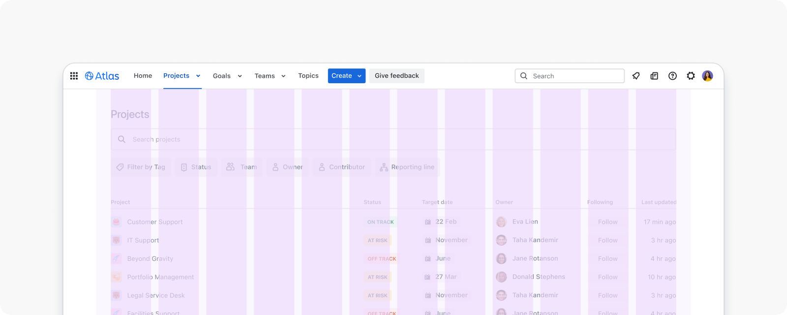 Layout regions are the building blocks for any web page. They are composed of elements and components that share similar functions. Atlassian’s layout grid starts below the top navigation, and provides structure to the main content.